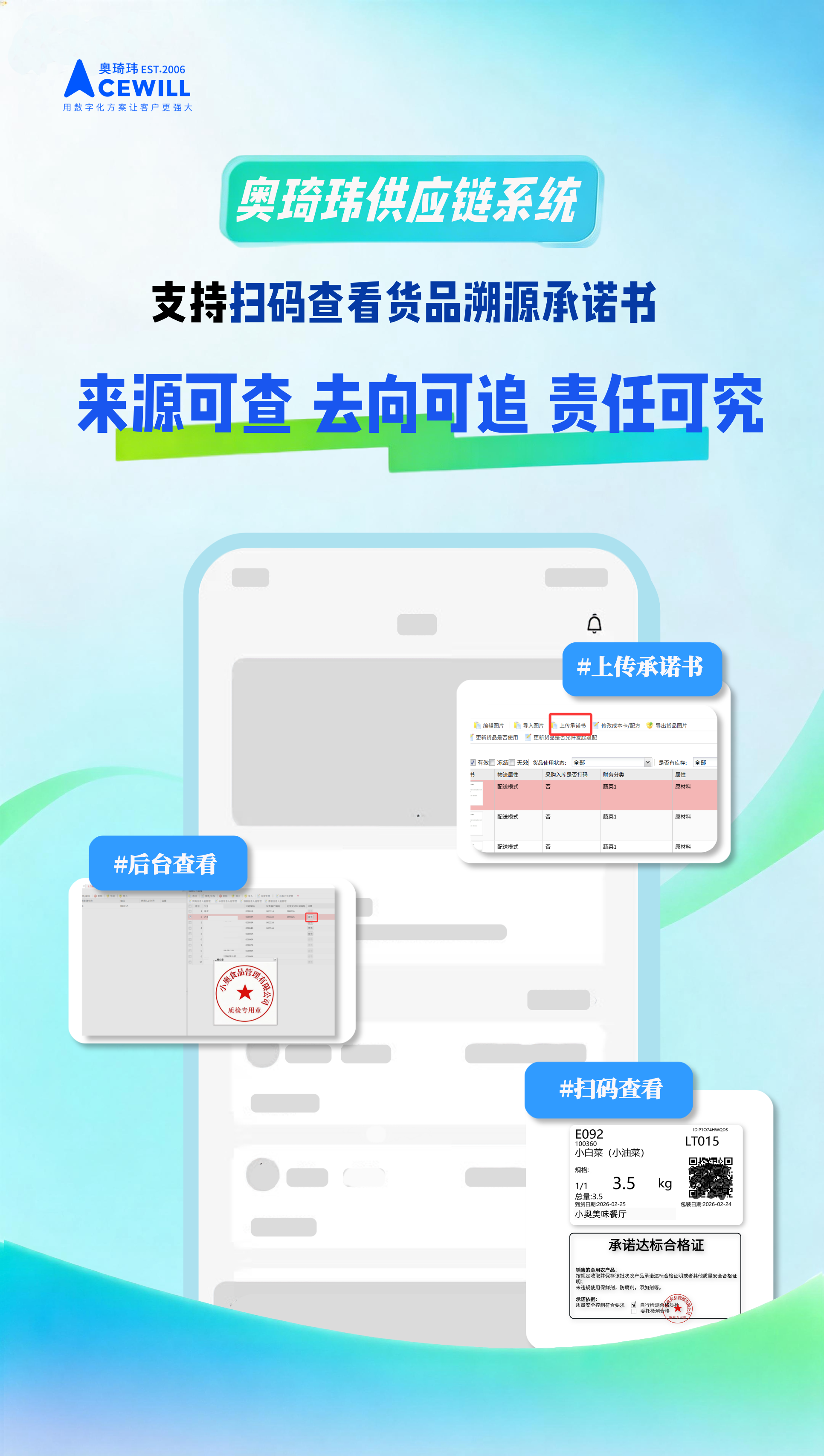 此外,系统新上线溯源承诺书功能,供应商可在后台上传带有公章的承诺书,用户通过后台或移动端扫码即可查看,实现食材“来源可查、去向可追、责任可究”,为食品安全保驾护航。