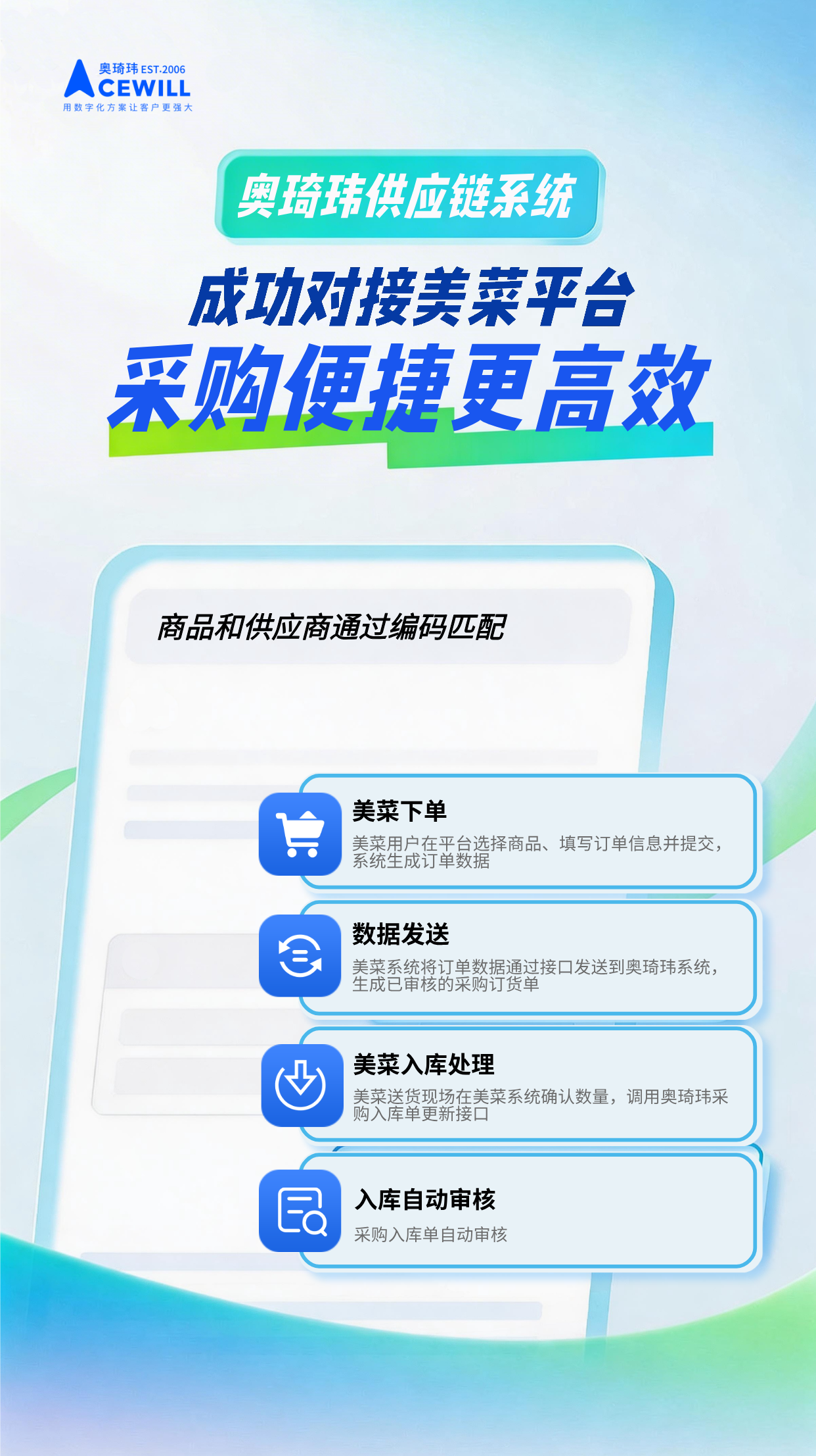 奥琦玮供应链系统近日成功实现与美菜平台的数据对接,并新增溯源承诺书功能,进一步提升采购效率与食品安全监控能力。